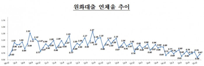 (서울=포커스뉴스) 올해 1월말 국내은행의 원화대출잔액과 연체율이 모두 상승했다. 29일 금융감독원에 따르면 1월말 국내은행의 원화대출잔액은 1360조4000억원으로 전월말 대비 7조6000억원(0.6%)증가했고, 연체율은 0.09%포인트 상승한 0.67%였다. 원화대출 연체율은 1개월 이상 원리금을 연체한 비율을 뜻한다. 원화대출 증가 추이를 살펴보면 중소기업의 증가액이 가장 많았다. 1월 중 중소기업 대출액은 4조원 증가한 580조6000억원이다. 대기업 대출은 1월 중 3조2000억원 증가한 182조5000억원이며, 가계 대출은 9000억원 늘어 563조7000억원으로 집계됐다. 가계대출의 경우에는 모기지론유동화잔액분까지 포함하면 전월말 대비 2조1000억원 증가했다. 1월 중 원화대출 연체율은 신규 대출분에 대한 연체발생액이 늘어나 상승했다. 월중 신규 연체발생액은 1조8000억원이며 연체채권 정리규모는 6000억원이다. 업종별로 살펴보면 부동산PF대출의 연체율이 높았다. 작년 12월말 4.61%였던 부동산PF대출 연체율은 1월말 0.06%포인트 증가한 4.67%를 기록했으며, 이 뒤를 건설업(3.55%)이 이었다. 금감원 측은 "취약업종의 부실화 가능성 및 가계부채 증가세 등 리스크요인을 지속 모니터링 할 예정"이라고 말했다.2016년 1월말 원화대출 연체율.<자료제공=금융감독원>