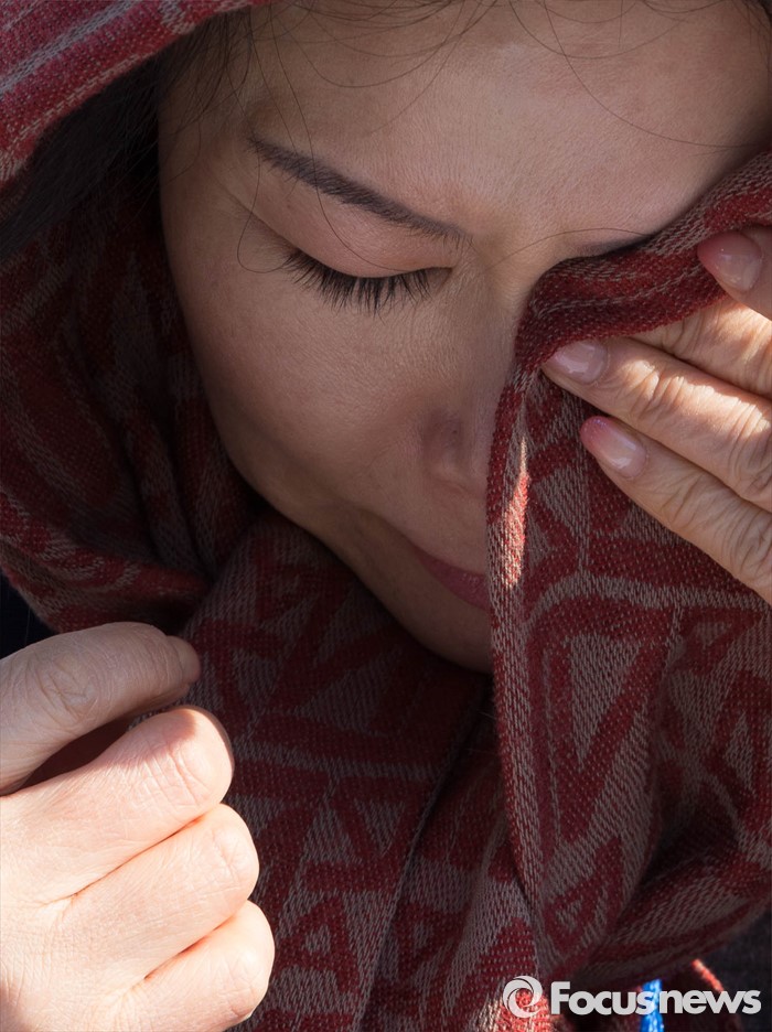 (파주=포커스뉴스) 16일 오후 경기도 파주시 통일대교에서 열린 '개성공단 평화대행진 집회'에서 한 참석자가 눈물을 닦고 있다.