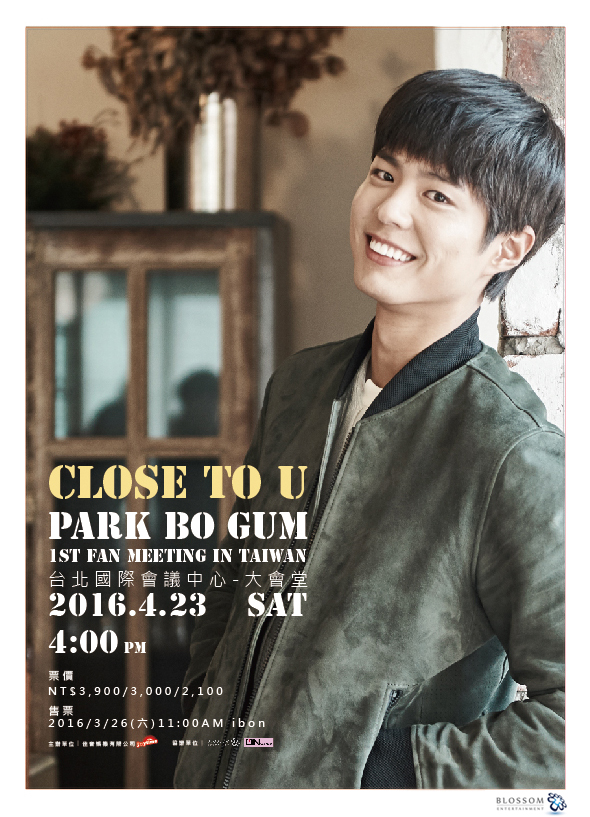 소속사 블러썸 엔터테인먼트는 18일 "박보검이 4월 23일 대만 타이 페이국제회의센터에서 팬미팅 'Close to U, Park Bo Gum 1st Fan meeting in Taiwan'을 진행한다"고 밝혔다.