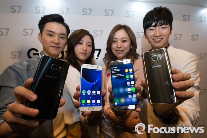 삼성카드가 삼성전자와 함께 운영하는 '갤럭시클럽'은 갤럭시S7(엣지 포함) 및 프리미엄 서비스팩을 삼성카드로 24개월 할부로 구매하고 1년 동안 사용한 뒤 반납하면 남은 할부금을 내지 않고도 최신 갤럭시S 시리즈를 다시 살 수 있는 프로그램이다.(서울=포커스뉴스) 10일 오전 서울 중구 신라호텔에서 삼성전자의 스마트폰 '갤럭시 S7 엣지와 갤럭시 S7'을 모델들이 선보이고 있다. 이번 제품은 듀얼 픽셀과 F1.7 조리개 탑재, 방수·방진과 대용량 배터리가 탑재되어 있다. 2016.03.10 허란 기자