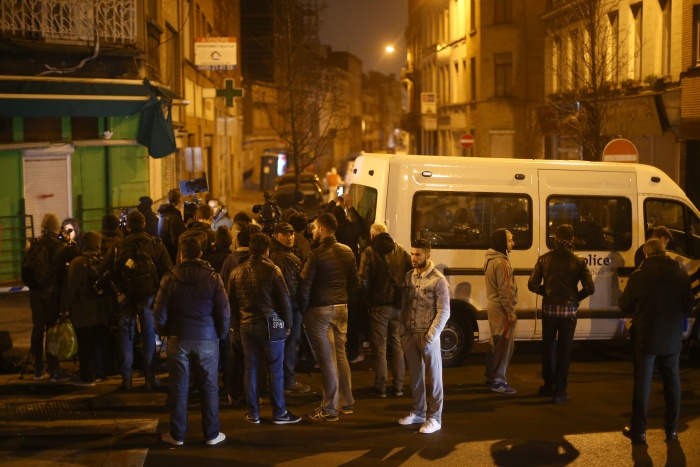 파리 테러 용의자 살라 압데슬람 체포작전이 벌어진 브뤼셀 몰렌빅 지구 골목에서 지난 18일 주민들이 모여 서 있다.(Photo by Carl Court/Getty Images)