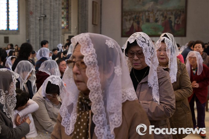 (서울=포커스뉴스) 부활절을 맞아 27일 정오 서울 중구 명동성당에서 열린 '예수 부활 대축일 미사'에 신도들이 참석해 있다.