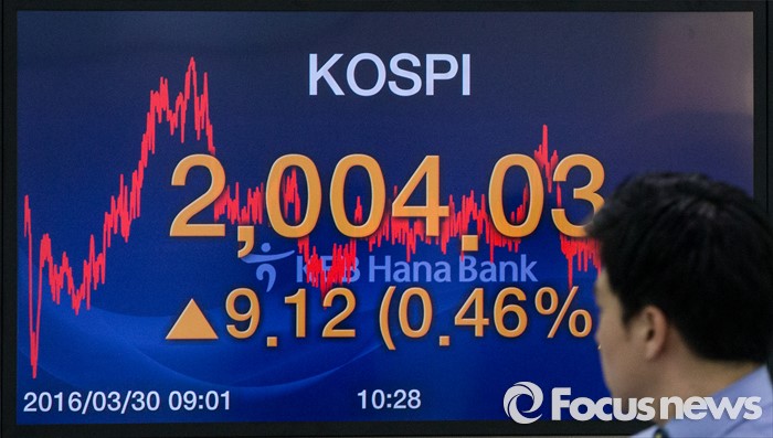 (서울=포커스뉴스) 30일 서울 중구 KEB외환은행 본점 딜링룸 전광판에 코스피 지수가 전일보다 9.12p (0.46%) 상승한 2004.03을 나타내고 있다. 이날 코스피지수는 재닛 옐런 미국 중앙은행(Fed) 의장의 비둘기파 발언에 힘입어 시가 기준 2000선을 돌파했다. 코스피가 시가 기준으로 2000선을 돌파한 것은 지난해 12월24일(2009.34) 이후 처음이다.