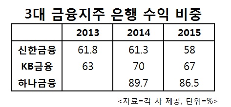 반면 하나금융의 은행 수익 비중은 80%후반대를 기록해 여전히 은행에 수익을 의존하는 모습을 보였다. 2014년 하나금융의 은행 수익 기여도는 89.7%였으며 2015년도 86.5%로 확인됐다. 하나금융은 작년 초 외환은행과 하나은행을 합병한 상태라 당분간 은행 수익 기여도는 더욱 클 것으로 예측된다.