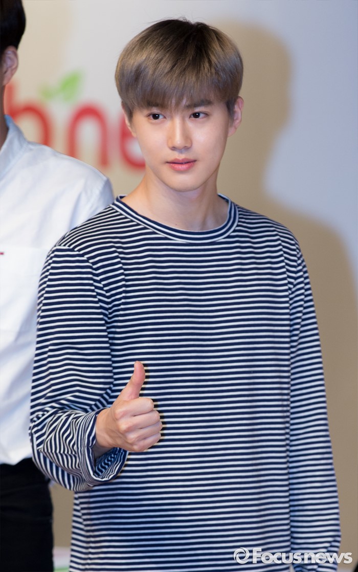 (서울=포커스뉴스) 29일 오후 서울 강남구 일지아트홀에서 열린 '굽네 볼케이노와 함께하는 엑소(EXO) 치밥 쿠킹 팬사인회'에서 수호가 포즈를 취하고 있다.