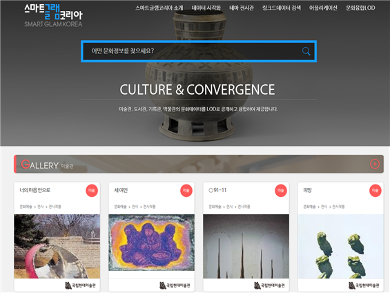(서울=포커스뉴스) 문화체육관광부는 한국문화정보원과 함께 미술관, 도서관, 기록관, 박물관 분야의 공공데이터 융‧복합 전산자료(DB)를 구축해 스마트글램코리아 홈페이지를 통해 서비스를 시작한다고 4일 밝혔다.