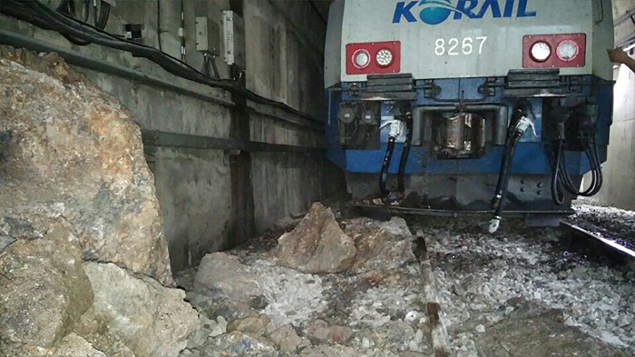 (서울=포커스뉴스) 4일 오전 8시 30분께 경북 봉화군 석포역에서 영주역 방향으로 향하던 무궁화호 1671호 열차가 낙석으로 탈선하는 사고가 발생해 코레일 관계자들이 수습작업을 하고 있다. <사진제공=봉화군>