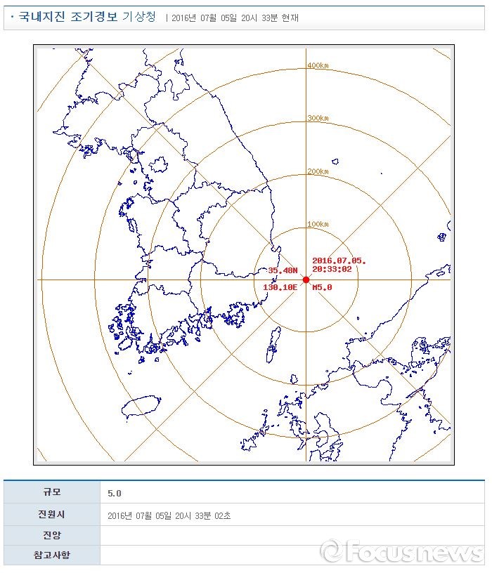 (서울=포커스뉴스) 5일 오후 8시33분경 울산 앞바다에서 5.0의 지진이 발생했다. 사진은 기상청의 국내지진 조기경보 자료. 국민안전처는 현재 지진에 대한 인명, 재산 피해는 없다고 밝혔다. <사진제공=기상청>
