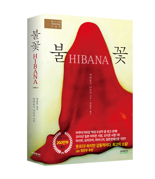 '불꽃_히바나'는 2015년 2월 문예지에 발표했고 3월 문예춘추 출판사에서 단행본으로 출간했다. 7월 제153회 아쿠타가와상을 받았다. 2016년 6월까지 260만부가 팔려나갔다. 131만부가 팔린 무라카미 류의 '한없이 투명에 가까운 블루'를 제치고 아쿠타가와상 80년 수상작 중 단행본으로는 가장 많이 팔린 책이 됐다. 소미미디어. 1만3000원.'불꽃_히바나' 표지.<사진제공=소미미디어>
