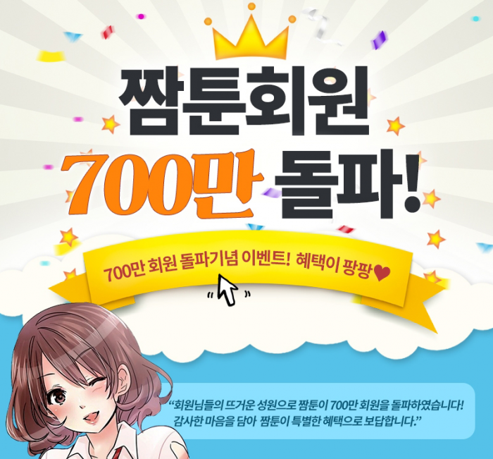 (서울=포커스뉴스) 투믹스의 웹툰 플랫폼 짬툰이 가입자 수 700만 명 돌파 기념해 회원들에게 보답하는 의미를 담은 이벤트를 실시한다.