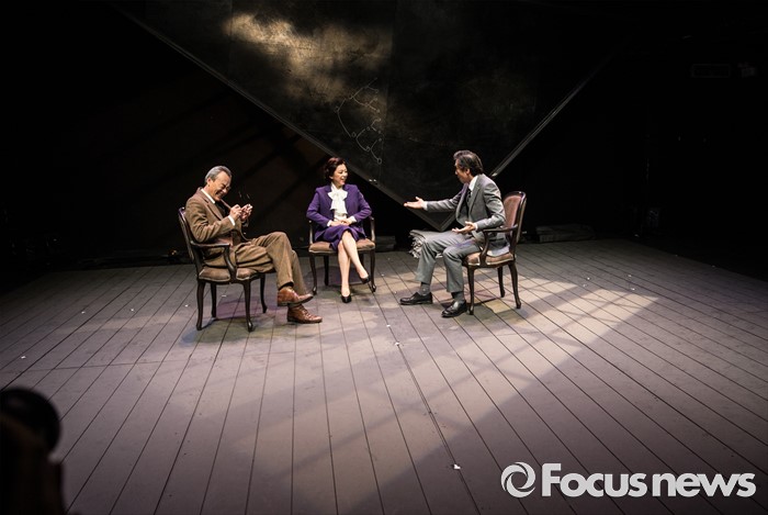 (서울=포커스뉴스) 14일 오후 서울 종로구 동숭아트센터 소극장에서 열린 연극 '코펜하겐' 프레스콜에 참여한 배우 남명렬(왼쪽부터), 이영숙, 서상원이 주요장면을 시연하고 있다.