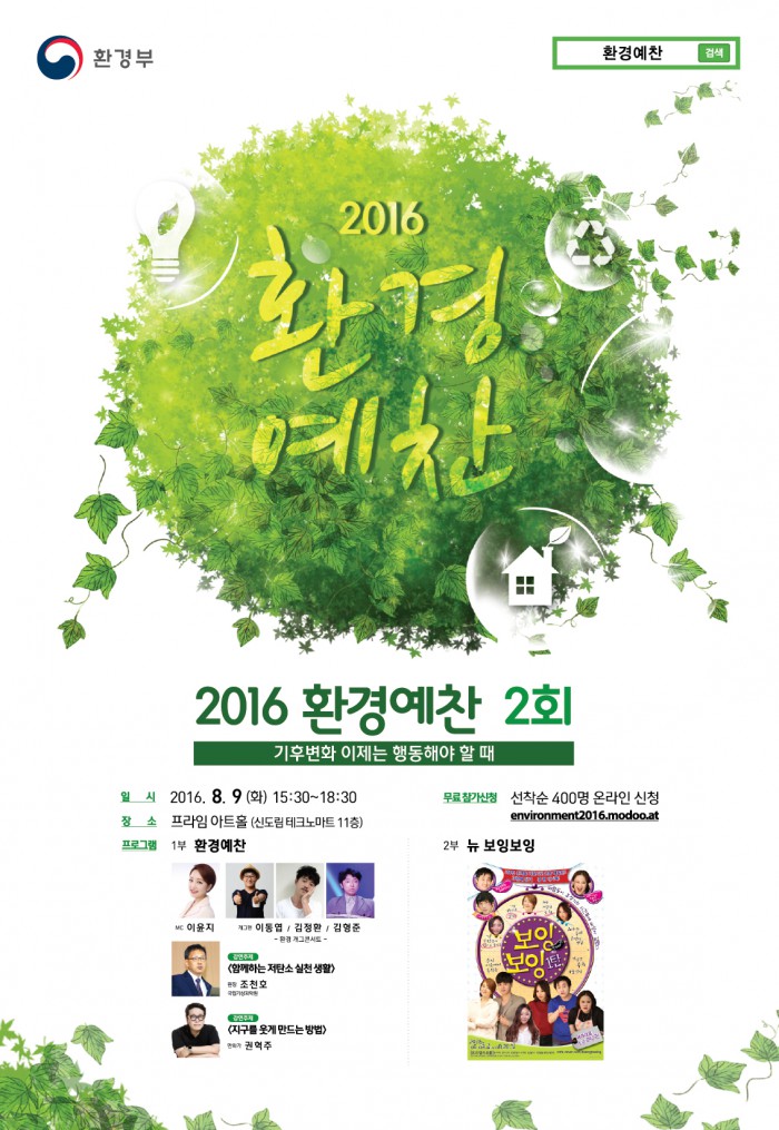 (서울=포커스뉴스) 환경부가 '기후변화가 삶에 끼치는 영향'을 이야기하는 '제2회 2016 환경예찬' 강연을 개최한다. 오는 8월9일 서울 구로구 프라임 아트홀에서 열린다.