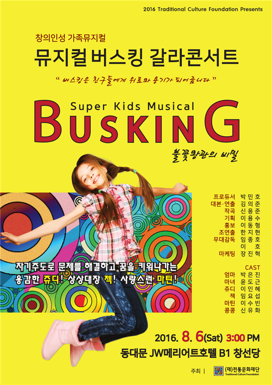 박 대표는 "음악과 드라마의 힘으로 어린이들이 자아(꿈과 끼)를 스스로 찾아가게 하자는 취지로 뮤지컬을 만들게 됐다"며 "전통문화재단 영재교육원 전문 선생님들이 스탭과 출연진으로 참여했다는데 의미가 있다"고 강조했다.가족뮤지컬 '버스킹' 포스터.<사진제공=전통문화재단>