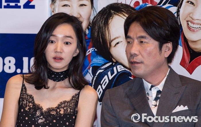 (서울=포커스뉴스) 26일 오후 서울 강남구 메가박스 코엑스점에서 열린 영화 '국가대표2' 언론시사회에 참석한 배우 수애(왼쪽)가 오달수와 대화를 나누던 중 놀란 표정을 짓고 있다.