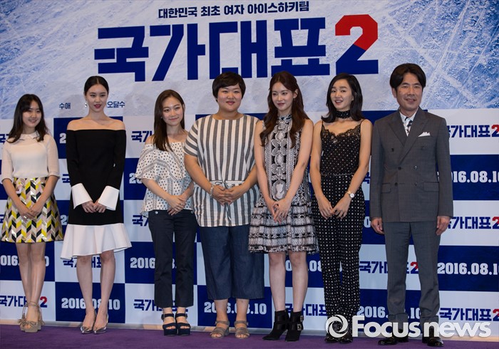 (서울=포커스뉴스) 26일 오후 서울 강남구 메가박스 코엑스점에서 열린 영화 '국가대표2' 언론시사회에 참석한 배우 진지희(왼쪽부터), 김예원, 김슬기, 하재숙, 오연서, 수애, 오달수가 포토타임을 갖고 있다.