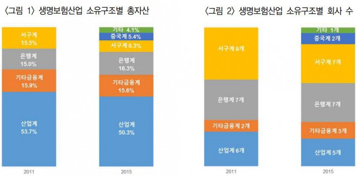 국내 생보산업에서 소유비중이 0%였던 중국계 자본의 비중이 늘어나고 유럽 등 서구계 자본 비중이 줄어들었다.