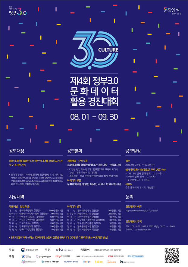 문화데이터 활용에 관심을 가지고 있는 일반 국민이면 누구나 문화포털 경진대회 사이트를 통해 참여할 수 있으며, 공모 범위는 '웹, 앱, 모바일, 웨어러블디바이스, 디자인, 제품제작, 3차원(3D) 프린팅, 시나리오, 영상' 등으로 제한 없이 다양하다.'제4회 정부3.0 문화데이터 활용 경진대회' 포스터.<사진제공=문화체육관광부>