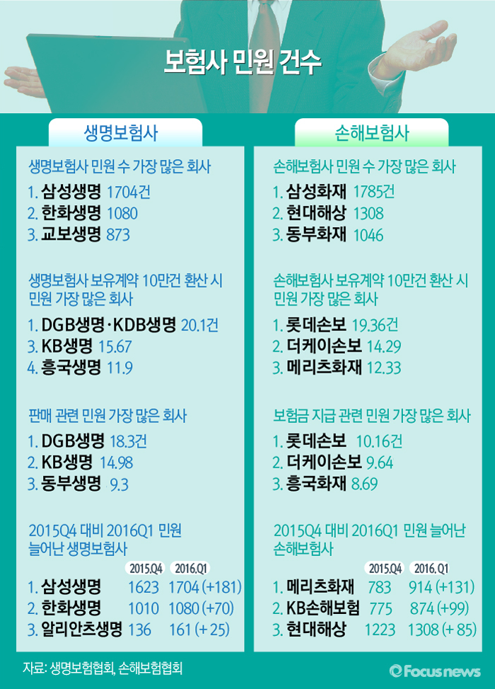 2일 생명보험협회와 손해보험협회에 공시한 국내 생명보험사(생보사)와 손해보험사(손보사)의 자율 민원 공시 자료를 분석한 결과 민원 건수가 2015년 4분기 대비 2016년 1분기 증가 건 수가 가장 많은 생보사는 삼성생명, 손보사는 메리츠화재인 것으로 나타났다.