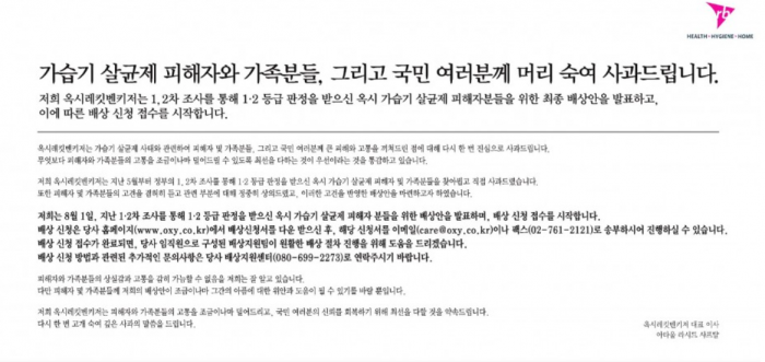 옥시는 이날 "가습기 살균제 피해자와 가족분들, 그리고 국민여러분께 머리 숙여 사과드린다"는 제목으로 주요 일간지 하단에 사과 광고를 게재했다.