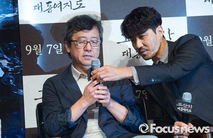 (서울=포커스뉴스) 9일 오전 서울 강남구 압구정 CGV에서 열린 영화 '고산자, 대동여지도' 제작보고회에 참석한 배우 차승원(오른쪽)이 강우석 감독의 마이크플 챙겨주고 있다.