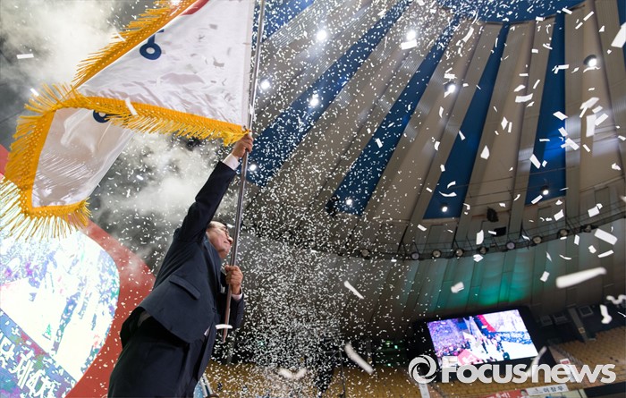 (서울=포커스뉴스) 9일 오후 서울 송파구 잠실실내체육관에서 열린 제4차 새누리당 전당대회에서 당대표로 선출된 이정현이 당기를 흔들어보이고 있다.