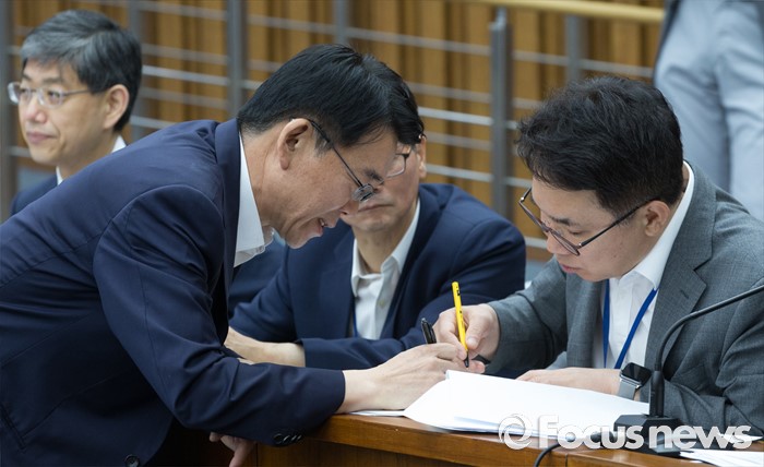 (서울=포커스뉴스) 11일 오전 서울 여의도 국회에서 열린 민생경제 특별위원회 전체회의에 참석한 강호인(왼쪽) 국토교통부 장관이 관계자들과 대화하고 있다.