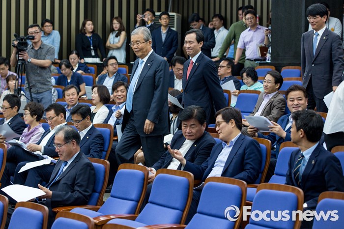 (서울=포커스뉴스) 김종인 더불어민주당 비상대책위 대표와 우상호 원내대표가 11일 오전 서울 여의도 국회에서 열린 의원총회에 참석 하기 위해 회의실로 들어서고 있다.