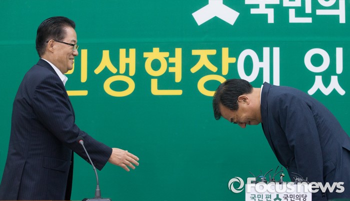 (서울=포커스뉴스) 11일 오후 서울 여의도 국회에서 박지원(왼쪽) 국민의당 비상대책위원장이 이정현 새누리당 대표와 면담에 앞서 인사하고 있다.