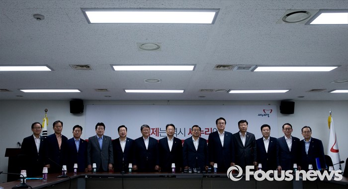 (서울=포커스뉴스) 11일 오후 서울 여의도 국회에서 열린 전기세 누진제 개편 긴급 당정 협의에 참석한 이정현 새누리당 대표, 정진석 원내대표, 유일호 경제부총리 겸 기획재정부 장관, 주형환 산업통상자원부 장관 등 참석자들이 취재진을 향해 포즈를 취하고 있다.