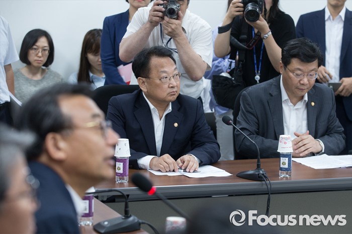 (서울=포커스뉴스) 11일 오후 서울 여의도 국회에서 열린 전기세 누진제 개편 긴급 당정 협의에 참석한 유일호(가운데) 경제부총리 겸 기획재정부 장관과 주형환(오른쪽) 산업통상자원부 장관이 유일호 새누리당 대표의 모두발언을 듣고 있다.